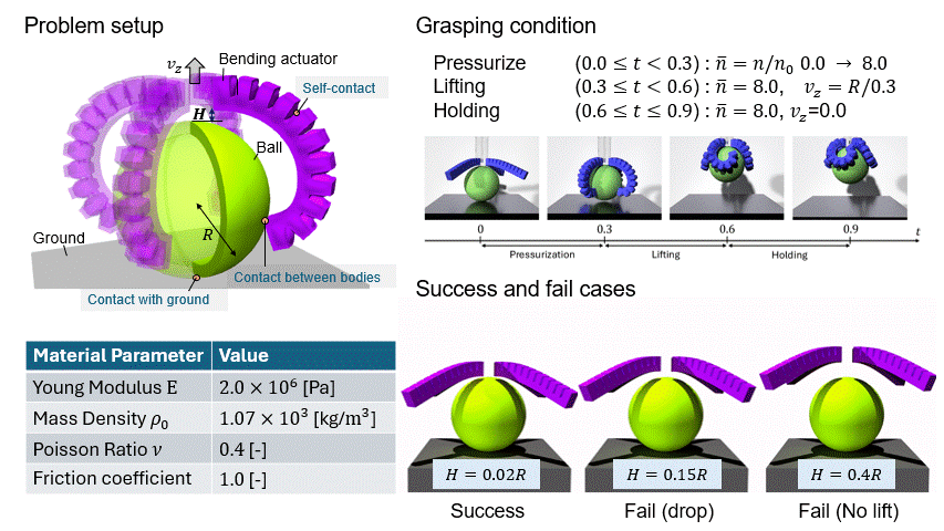 Soft robots involve multiple interacting physical phenomena, including large deformation, contact, friction, material nonlinearity, and actuation mechanisms such as fluid pressure or thermal response. In this research, we develop numerical methods for solving strongly nonlinear problems, including contact and friction, based on finite-deformation continuum mechanics. Furthermore, by integrating model order reduction and learning-based approximations, we establish a computational framework that enables rapid evaluation within optimization loops. This approach allows the integrated exploration for the systematic design methodology of soft robots.