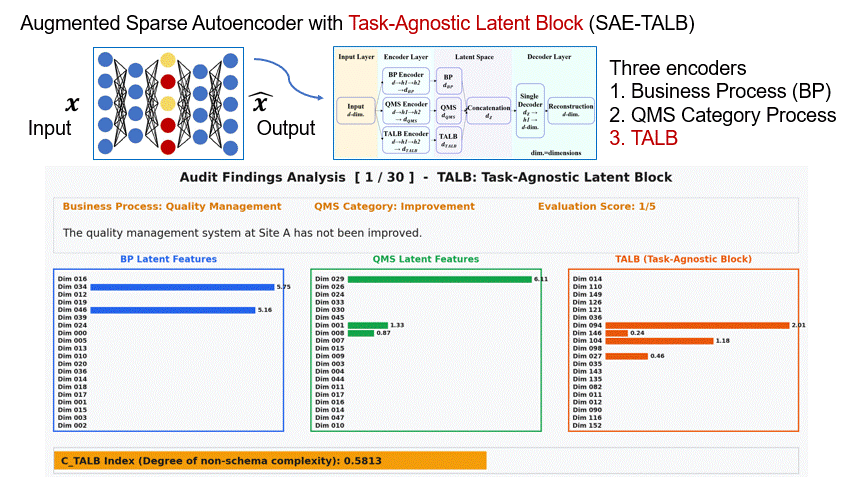 In this approach, audit texts are first vectorized using a sentence embedding model and then compressed into a latent space via a sparse autoencoder (SAE). The network is trained so that interpretable features are concentrated into a small number of activated nodes, enhancing explainability.