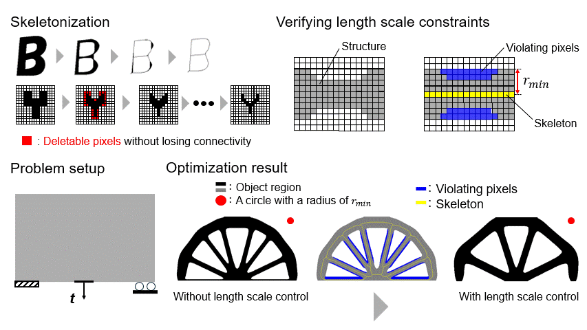 In our laboratory, we investigate dimension-control methods that incorporate image processing techniques, such as thinning algorithms, directly into the optimization process. By embedding manufacturability constraints at the optimization stage, we aim to systematically enforce maximum and minimum feature-size requirements while maintaining structural performance.