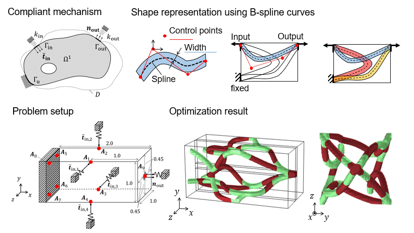 To address these issues, our laboratory investigates optimization methods based on the spline representation approach, in which the material distribution is represented by multiple splines. This framework enables explicit control of the minimum structural thickness and ensures material continuity across the design domain boundaries, leading to practical and manufacturable optimal structures.